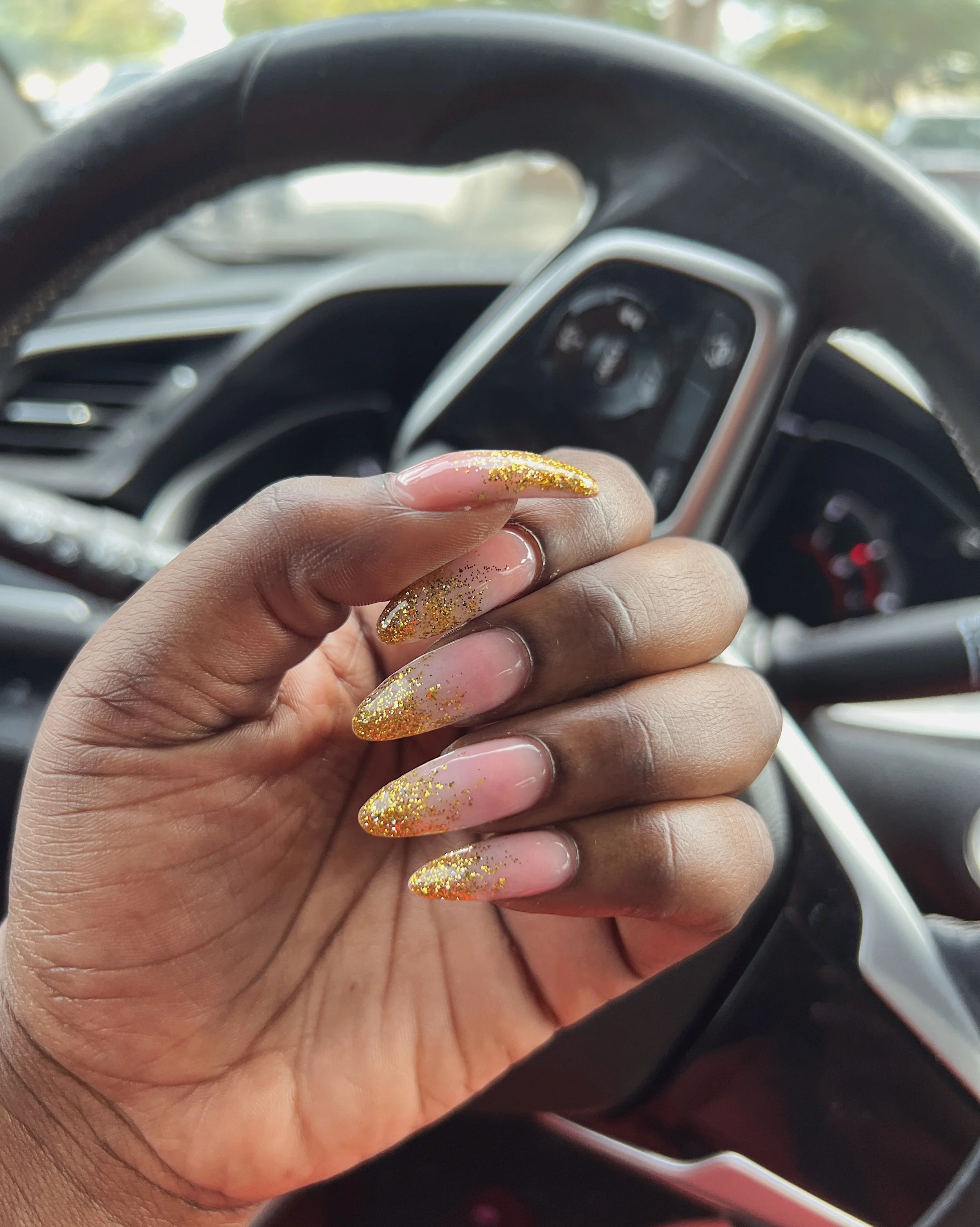 My nail tech first used the pink acrylic powder to overlay my nails. After doing that, she then used the color “gold 910” off of the DND brand. Last but not least, she topped it off with a clear coat.